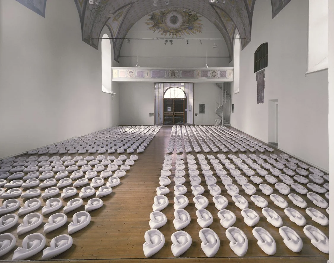 Hannes Stellner, Installation “the carpet too is moving under you”, ehem. Klosterkirche in Traunstein, 637 Ohren aus Stuckgips, Länge je 63 cm, 2005. Foto Klaus-Maria Einwanger