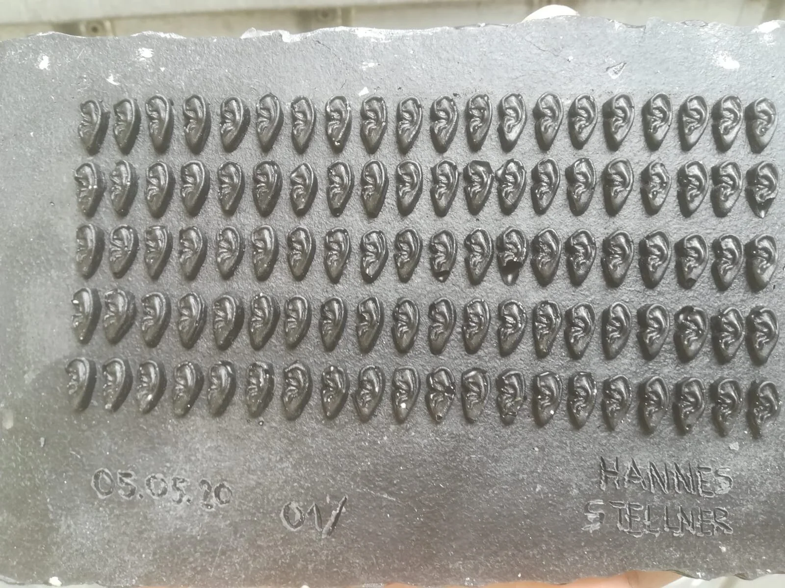 Modell aus Wachs, hergestellt nach der Vorlage des Miniaturmodells für die Installation in der Klosterkirche in Traunstein (2005, siehe Foto oben) für die Schmuckedition 2020. Größe einzelner Ohren ca 12x6 mm