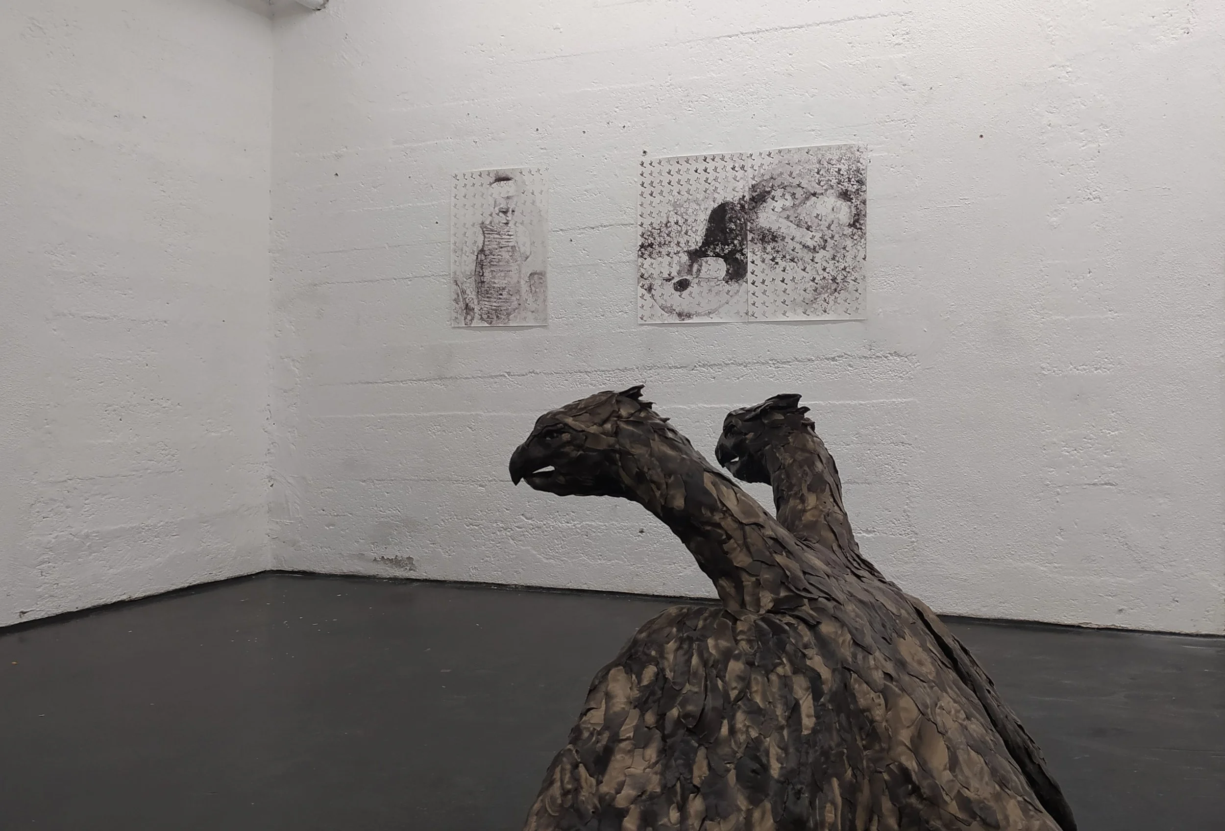 In zahlreichen Aquarellen und Plastiken reflektiert Tanja Fender über die Geschehnisse der letzten zwei Jahre. Jede ihrer Arbeiten ist eine tiefe Auseinandersetzung entweder mit den inzwischen bekannten Medienbildern – inklusive Propaganda – oder mit den Hintergründen und Lebensumständen, die hierzulande viel weniger bekannt sind. Die Künstlerin, die ihre Kindheit und Jugend in Kuzbass in Sibirien verbracht hat, wendet ihren Blick auf die russische Provinz, in der Rückständigkeit, obsolete patriarchale Strukturen, Misogynie und Intoleranz, alltäglicher Rassismus und enorme wirtschaftliche Mängel zum Alltag gehören. Die Misere macht mürbe und resultiert entweder in der Apathie und Gleichgültigkeit oder in der bereitwilligen Unterstützung des Regimes und des Krieges. Der brutale Frauenschläger in der Aquarellserie, der den Gürtel mit der schweren Schnalle zur Kindererziehung nutzt, ist in seinem inneren nur noch ein elendes ängstliches Nagetier. Aus der Provinz werden viele Menschen für den Krieg eingezogen, überzeugt mit Geldsummen, die märchenhaft für jene Regionen erscheinen. Pläne für nach der Rückkehr scheitern jedoch oft, selbst wenn man diesen Fleischwolf überlebt. Fehlende Gliedmaßen, gebrochene Psyche lassen einen das Leben danach nicht mehr genießen – auch dazu gibt es schonungslose Bilder der Künstlerin. Rekrutiert werden gern auch ethnische Minderheiten. Symbolisch steht dafür das Bild des zerfleischten Rentieres. Rentierhaltung ist verbreitet im Norden Russlands, im Fernosten und in Sibirien bei Komi, Jakuten, Nenzen, Saami, Chanten, Tschuktschen, Ewenken und einigen weiteren Nomadenvölkern, die von Russland kolonisiert wurden und die heute als Kanonenfutter an die Front geschickt werden.