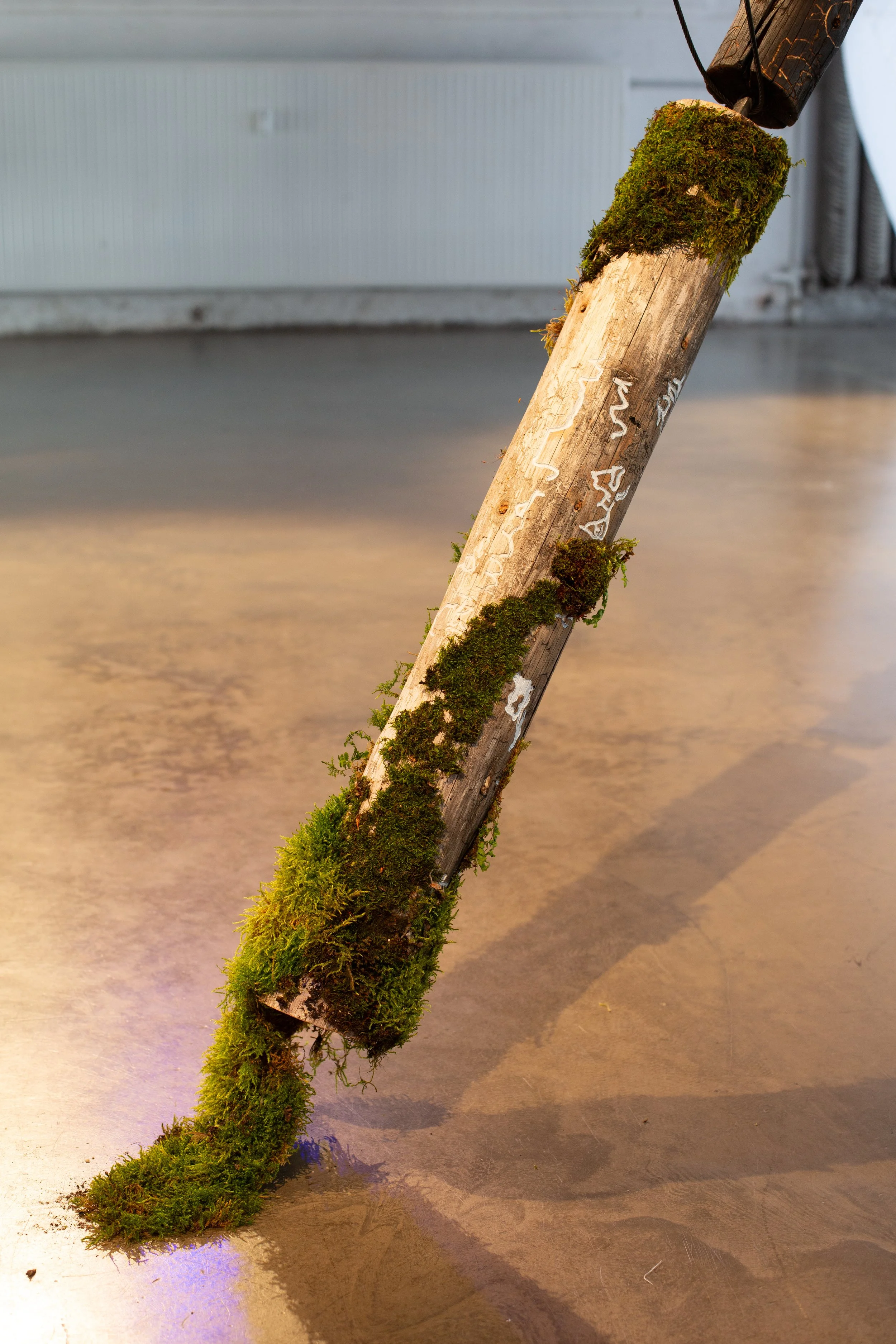 Eine sehr besondere gemeinsame Installation, die den Beginn der künstlerischen Zusammenarbeit der Gruppe im Mai vor einem Jahr in Erinnerung ruft, ist der zerteilte, jeweils individuell gestaltete und in der Ausstellung neu zusammengefügte Maibaum. Lena Engel hat ihren Abschnitt mit Moos partiell verkleidet und die Borkenkäferspuren farbig hervorgehoben – ein Echo zu Maximilian Engels Arbeit. Letzterer hat den Stamm abgeflammt und in die schwarze Oberfläche Nachzeichnungen der Wurmspuren sowie Inschriften eingefräst, wie man sie häufig auf Wanderwegen in Bäume eingeritzt vorfindet. Damit bringt er Naturzeichnungen geschickt mit dem Postvandalismus zusammen und verdoppelt die Wirkung, indem er in Spalten im Stamm Plexiglasflächen einsetzt, auf die er besagte Muster nochmal überträgt. Moritz Steinhauser, der ideenstiftend für diese Installation war, nutzt den Stamm als Hängefläche für seine postvandalistischen Zunftschilder. Und Leonard Senholdt gestaltet seinen Abschnitt auch mit einer gewissen Ironie. Er hat aus den abgehobelten Spänen von seinem Baumstück und Zellulose den Stamm als Hülle abgeformt und diese für die Neuzusammensetzung verwendet. Wie bei der Stoffskulptur ging es ihm hier um die Umkehrung der Materialcharakteristika, diesmal vom Schweren ins Leichte. Patrik Graf hat durch den Einsatz von zahlreichen Keilen seinen Stammabschnitt gekrümmt – im Sinne der Transformation als Leitgedanken dieser Ausstellung.